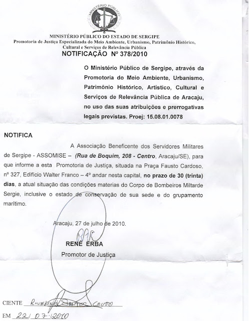 O Promotor de Justiça Renê Erba oficiou no dia de ontem a ABSMSE para que informe à Promotoria do Meio Ambiente, Humanismo, Patrimônio Histórico, Artístico, Cultural e Serviços de Relevância Pública de Aracaju, a atual situação das condições materiais do Corpo de Bombeiros Militar de Sergipe, inclusive o estado de conservação de sua sede e do grupamento marítimo.